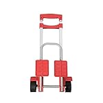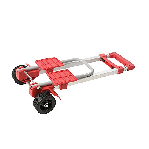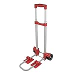 Lightweight hand truck, folds for storage, reopens quickly. Wide wheels and axle for stability.