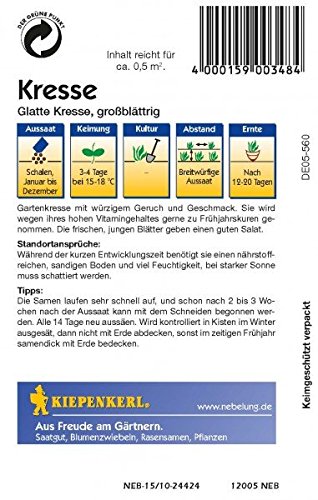 Die kahlen Stängel unter Zuhilfenahme von den glatten Laubblättern sind schnell wachsend darüber hinaus eignen sich qua Treib- darüber hinaus Freilandsorte. Die Gartenkresse hat einen scharfen Würze darüber hinaus Geschmack. Sie wird da obendrein ihres hohen Vitamin-Gehaltes natürlich zu Frühjahrskuren genommen. Die frischen, jungen Blätter geben einen guten Salat.