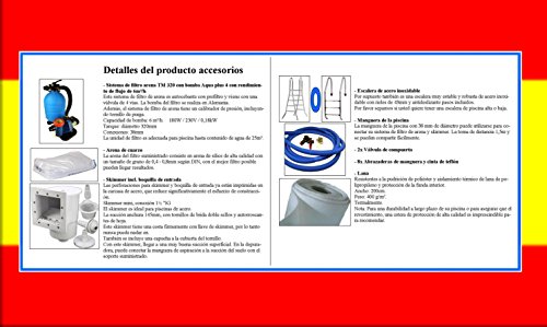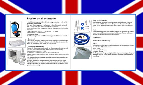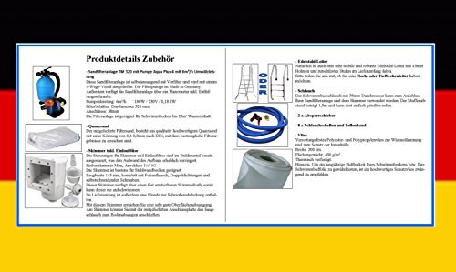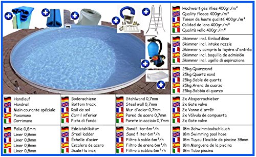 Lieferumfang: Spezial-Handlauf, Bodenschiene, Stahlwand 0,7mm, Folie 0,8mm, Hochwertiger Sandfilter 6m³/h, Skimmer inkl. Einlaufdüse, Edelstahlleiter, Quarzsand, hochwertiges Vlies 400g/m², Schwimmbadschlauch, Absperrschieber
