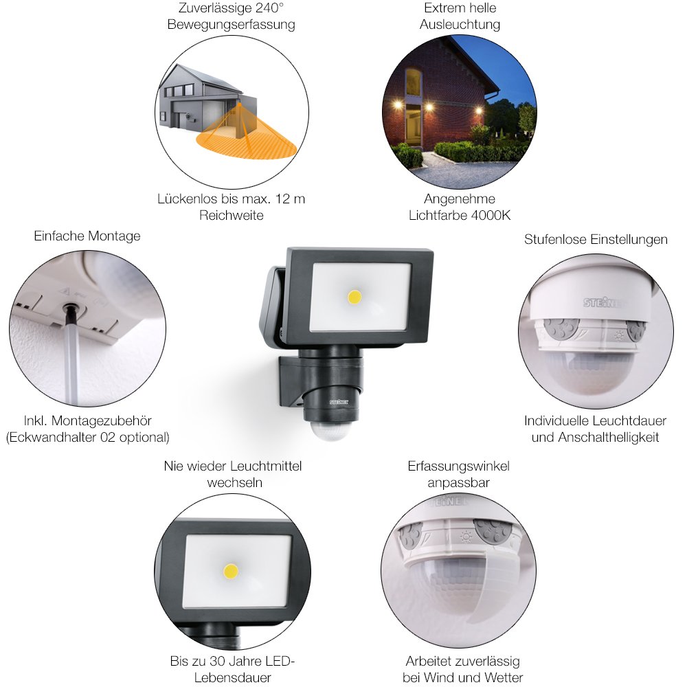 Hohe langlebigkeit. Hochwertige Materalien wie UV-Beständiger Kunststoff und Aluminium machen den Strahler sehr widerstandsfähig