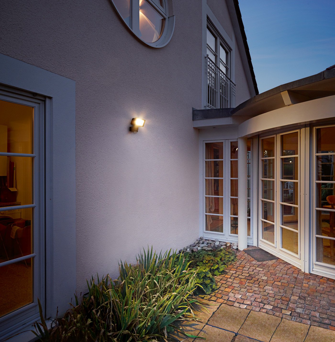 Optionale Eckmontage möglich. Der 240° Sensor kann so zwei Hausseiten überwachen