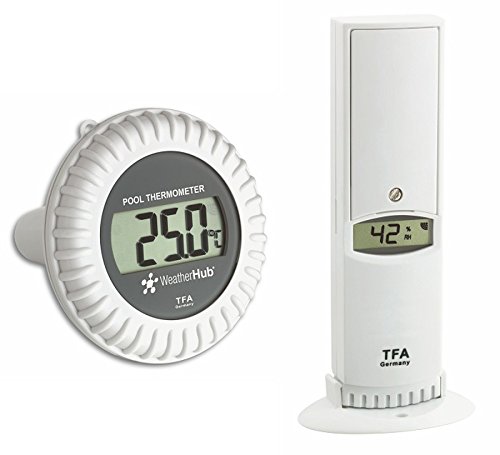 Dies ist ein Sensor jedweder dem System „WeatherHub“ zum Überwachen der Wassertemperatur von Schwimmbad, Whirlpool oder Teich