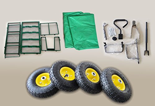 Technische Aussagen: Eigengewicht: ca. 23,5kg Expansion ca. (LxBxH): 108cm x 52cm x 73cm Gesamtlänge mittels Haltegriff 192cm Gesamthöhe mittels aufgestellter Deichsel 108 cm max. Ladegewicht: 550 kg Reifengröße: 26cm Luftreifen Material: Metall Alt werden sind luftbefüllt Innenplane ist abnehmbar Lieferumfang: Bollerwagen mittels Innenplane Montagematerial Montageanleitung