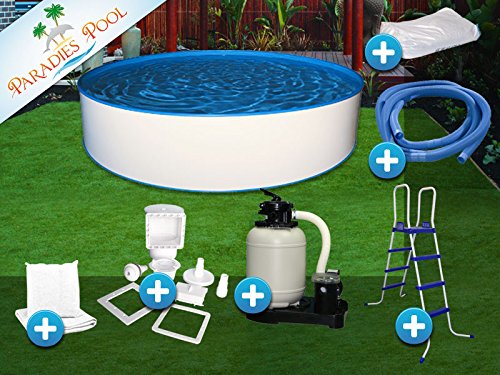 Das perfekte Komplettset für den ultimativen Badespaß. Das Rundbecken Set ist qua Aufstellbeckenset konzipiert und enthält die Gesamtheit Nötige an Zubehör, um den Badespaß sofort genießen zu können. Unsere rundform Stahlmantelbecken zeichnen sich durch Hochwertigkeit alle und sind deutsche Qualitätsprodukte. Der Stahlmantel ist verzinkt, innen schutzlakiert und außen kunststoffbeschichtet. Die Stahlmantelstärke beträgt 0,4 mm. Der Handlauf und die Bodenschiene sind alle hart PVC gefertigt und also unempfindlich gegen Korrosion und Kratzer. Die Folie ist 0,4 mm fulminant und wird mit Einhängebiese geliefert. Weiterhin zeichnet sie sich durch hohe Passgenauigkeit alle. Zum Becken gehören Stahlmantel, Folie, Handlauf, Bodenschiene. Im Set enthalten: 1 x Einbauskimmer alle Antiblockiersystem-Kunststoff in weiß inkl. Einlaufdüse, 2 Winterverschlusskappen, Bodenreiniger-Anschlussplatte, Spezialdichtungen, Schrauben (Edelstahl) für Stahlwandpools, Blende (Schraubenköpfe sind folglich nicht sichtbar), Skimmerklappe (mit Federstifte), Skimmerkorb und Schlauchanschluss 32/38 mm. 1 x Sandfilteranlage, Pumpenleistung: 4 m³/h, 150W / 230V / 50 Hz / 0,15 kW, Filterbehälter: Durchmesser 300 mm, Anschlüsse: 38 mm geignet für Schwimmbecken bis 27 m³ Wasserinhalt, Maße: 520 mm x 420 mm x 640 mm, Empfehlung: Das Schwimmbadwasser sollte 1,5 mal am Tag umgewälzt werden. 1 x Quarzsand 25 kg Körnung 0,4 bis 0,8 mm 1 x Synthetisches, verrottungsfestes Vlies mit einer Stärke von 180 g/m² 1 x 3-stufige mit großer Plattform für Becken bis 1,22 m Höhe, die Tritte und die große Plattform sind alle PVC Farbe voll und die Metallkonstruktiuonen sind gegen Wassereintritt geschützt 4 x Schwimmbadschlauch Durchmesser 38 mm mit einer Länge von summa summarum 6 m (1 Element ist 1,5 m lang) 4 x Schlauchschellen Unsere Becken werden vorgestanzt (für Skimmer und Einlaufdüse) geliefert.