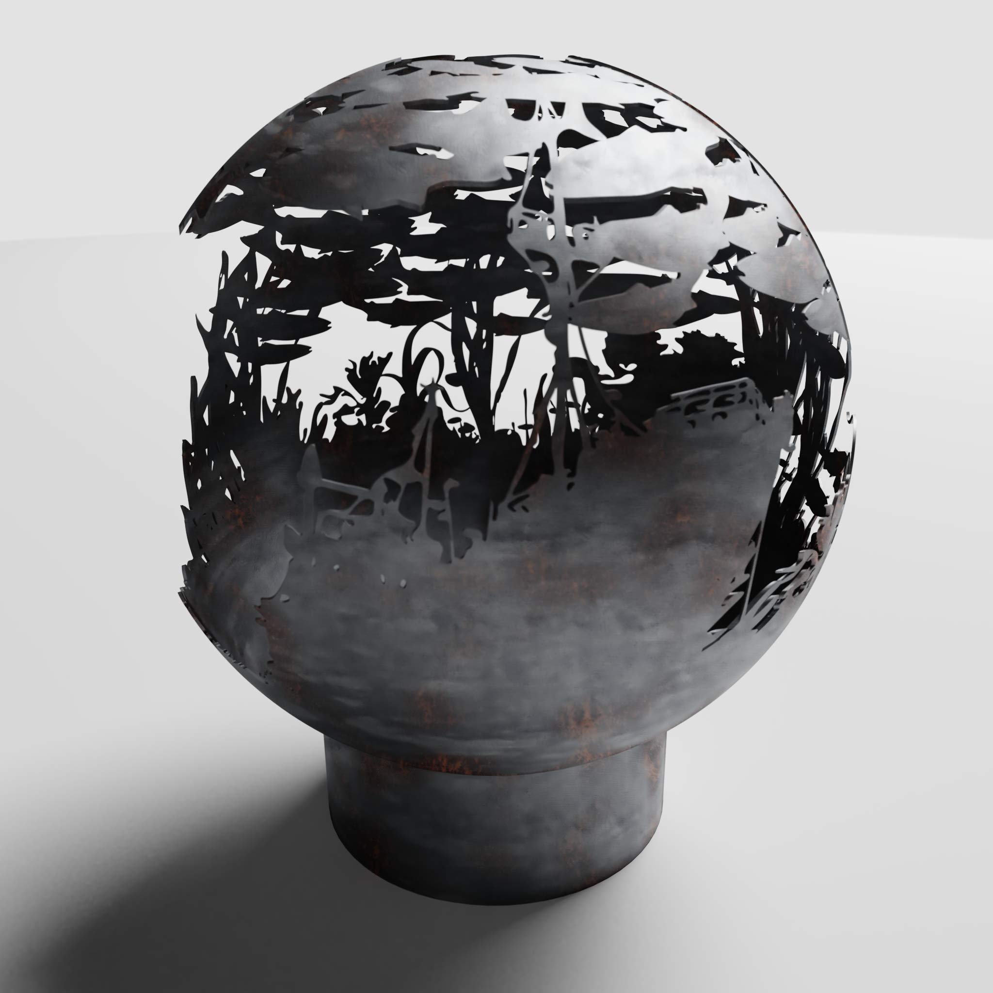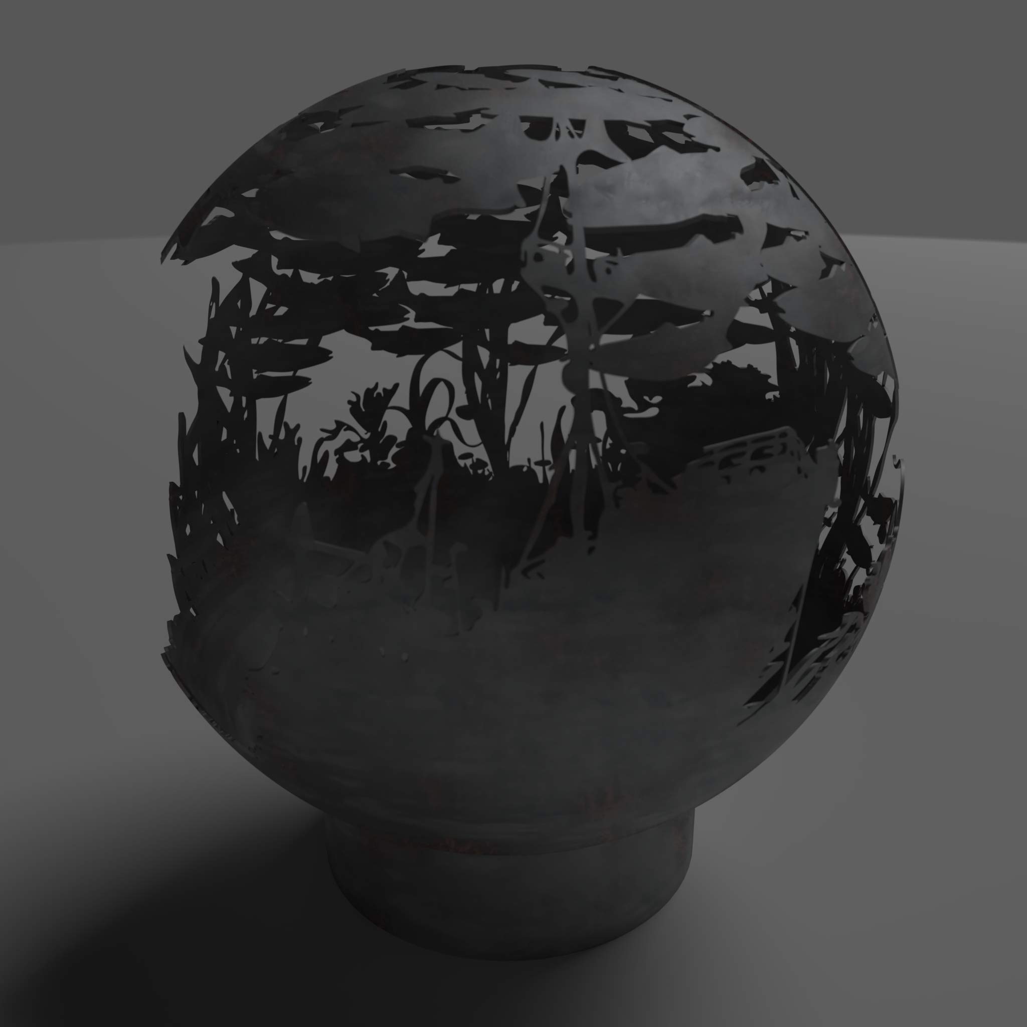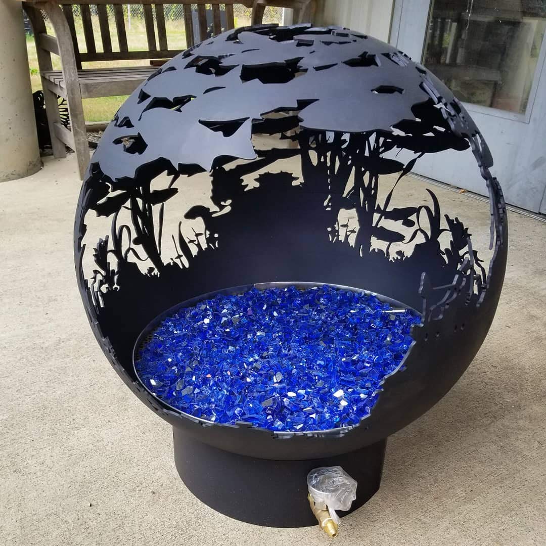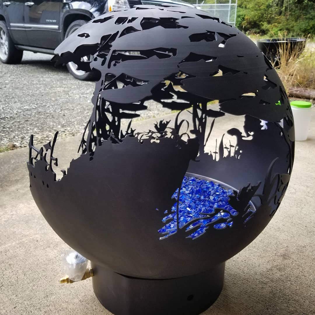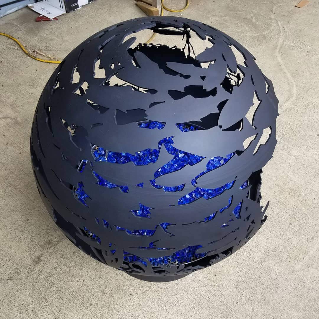 Spherical firepit available nicht“ or 37″ sizing featuring a school of salmon swimming through coastal waters