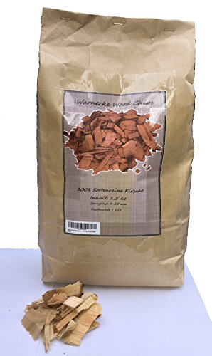 Holzart: Kirsche Absolutbetrag: 1,5 kg = 7 Liter Restfeuchte 0 – 5 % Spangröße der Räucherchips: 4-12 mm (grobe Räucherspäne)
